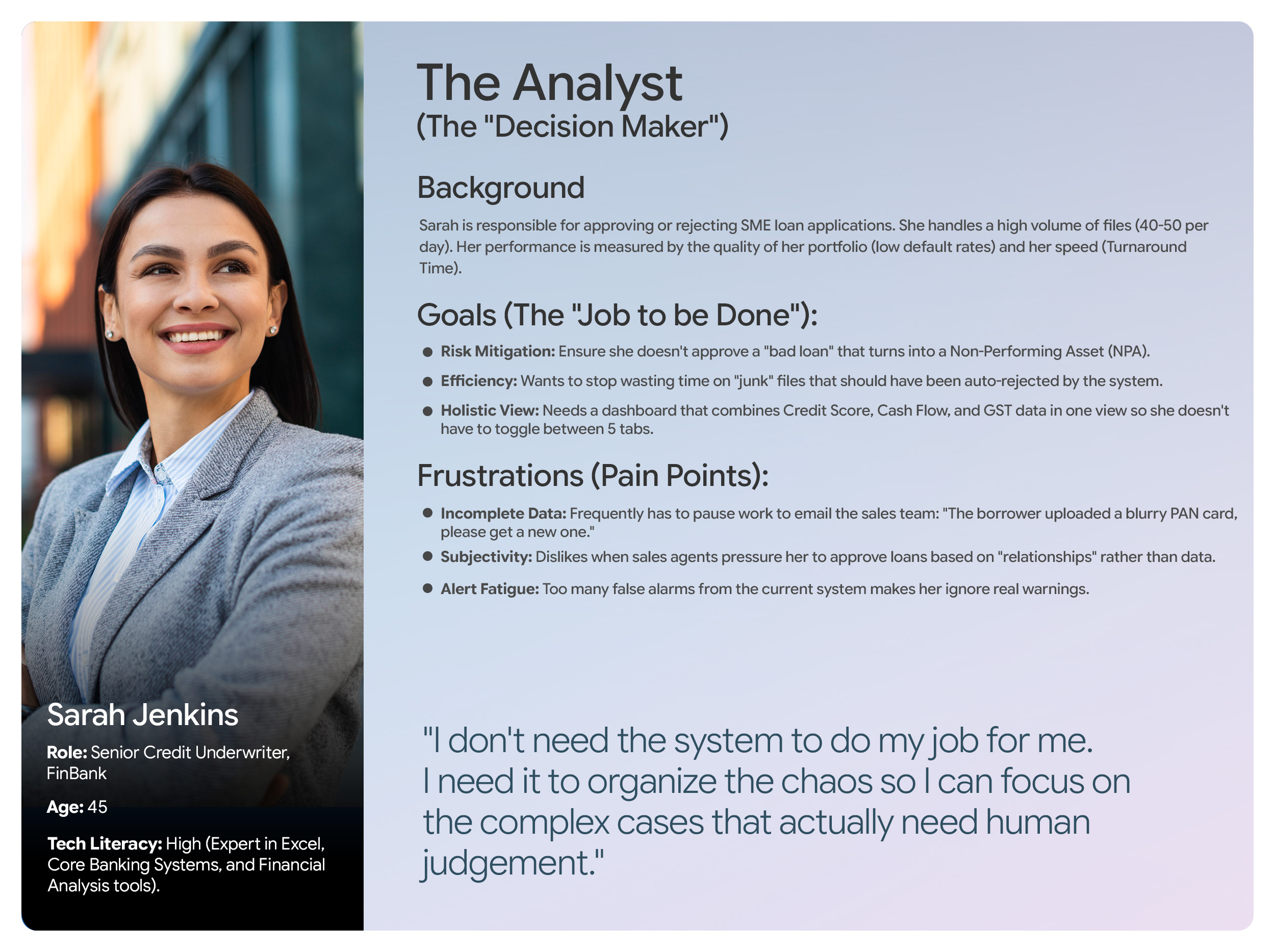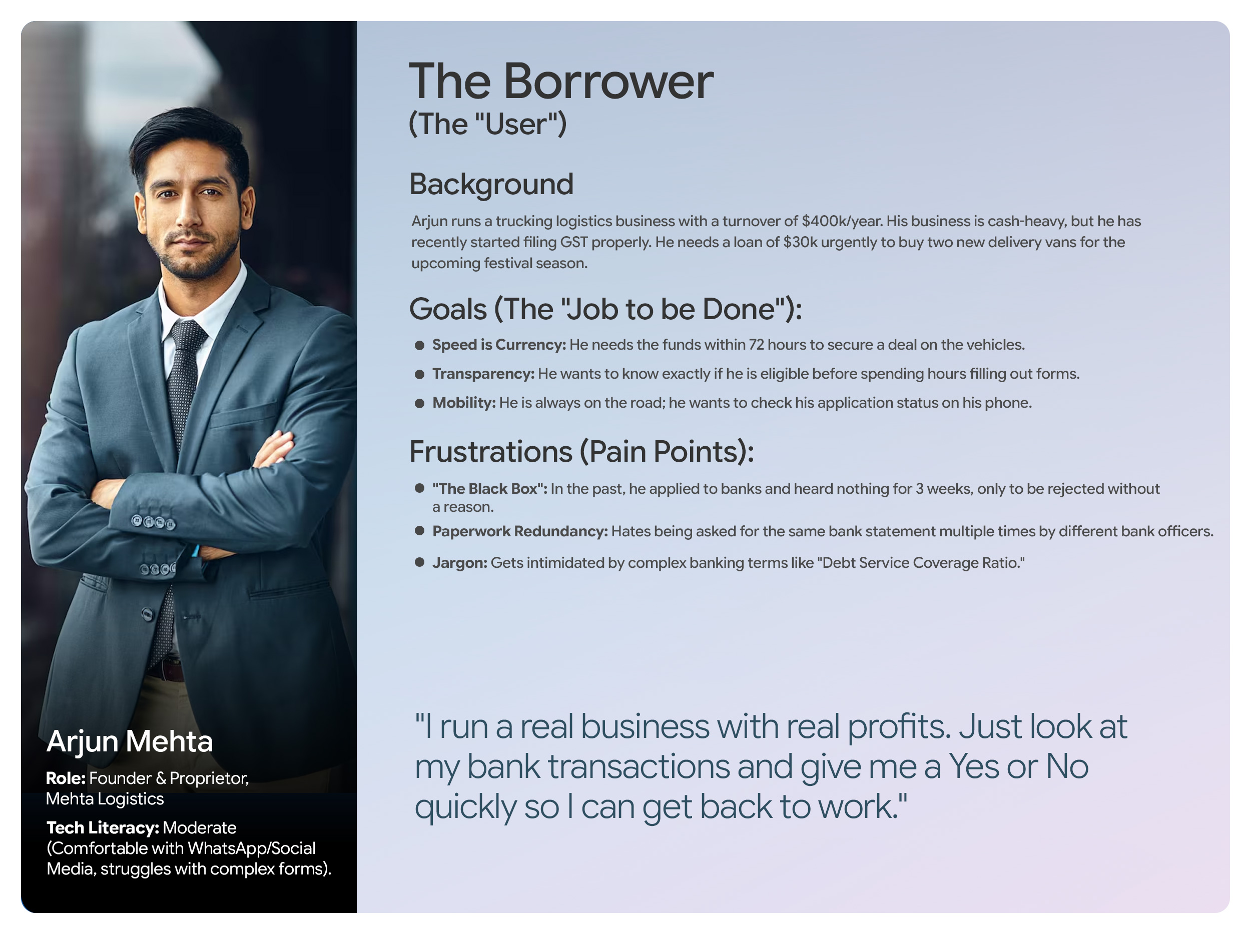 Core Issue: Traditional lending for Small and Medium Enterprises (SMEs) is manual, fragmented, and notoriously slow. Unlike salaried individuals with fixed income, SMEs have complex financial footprints that banks struggle to assess efficiently using legacy methods.
