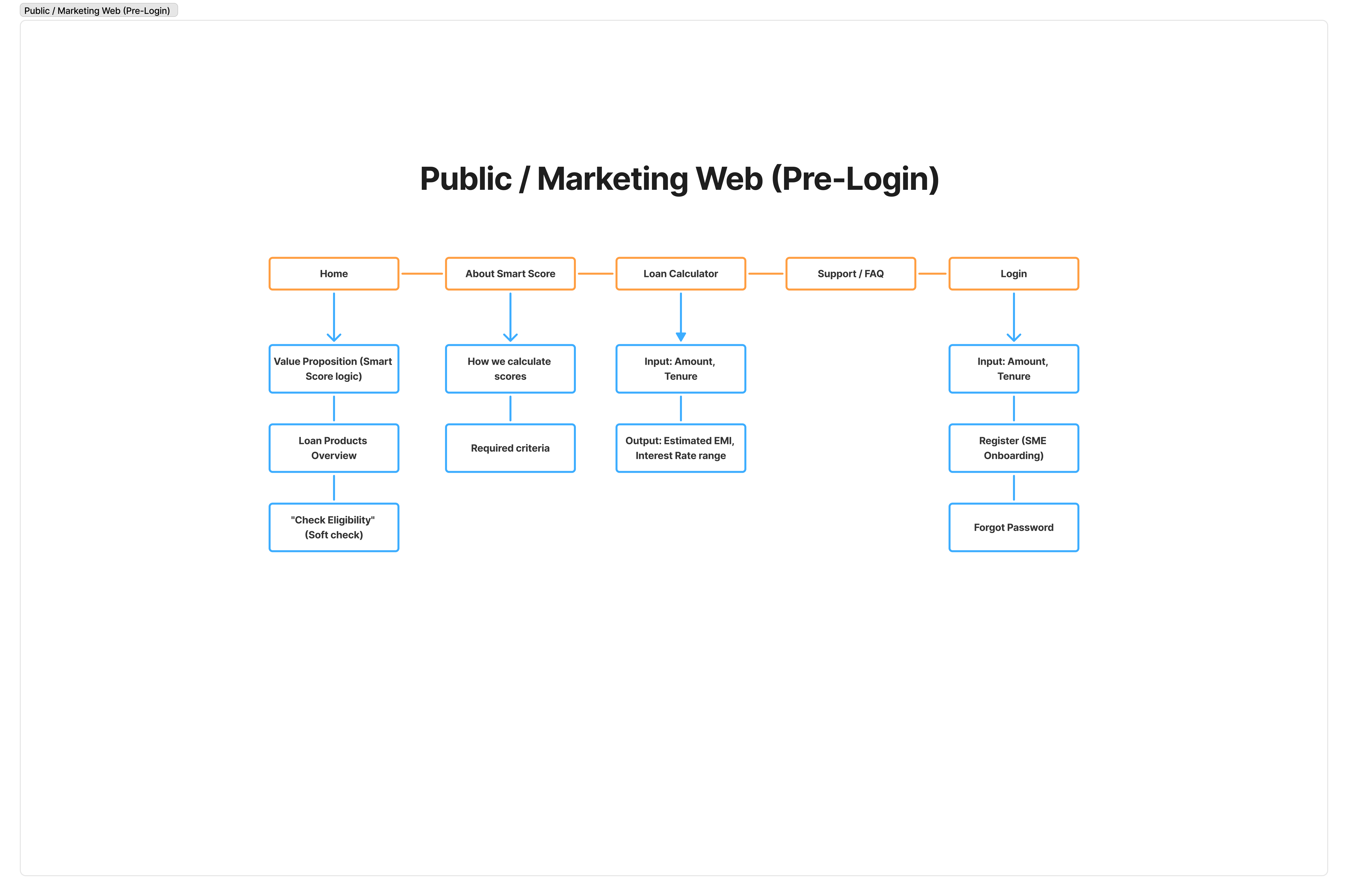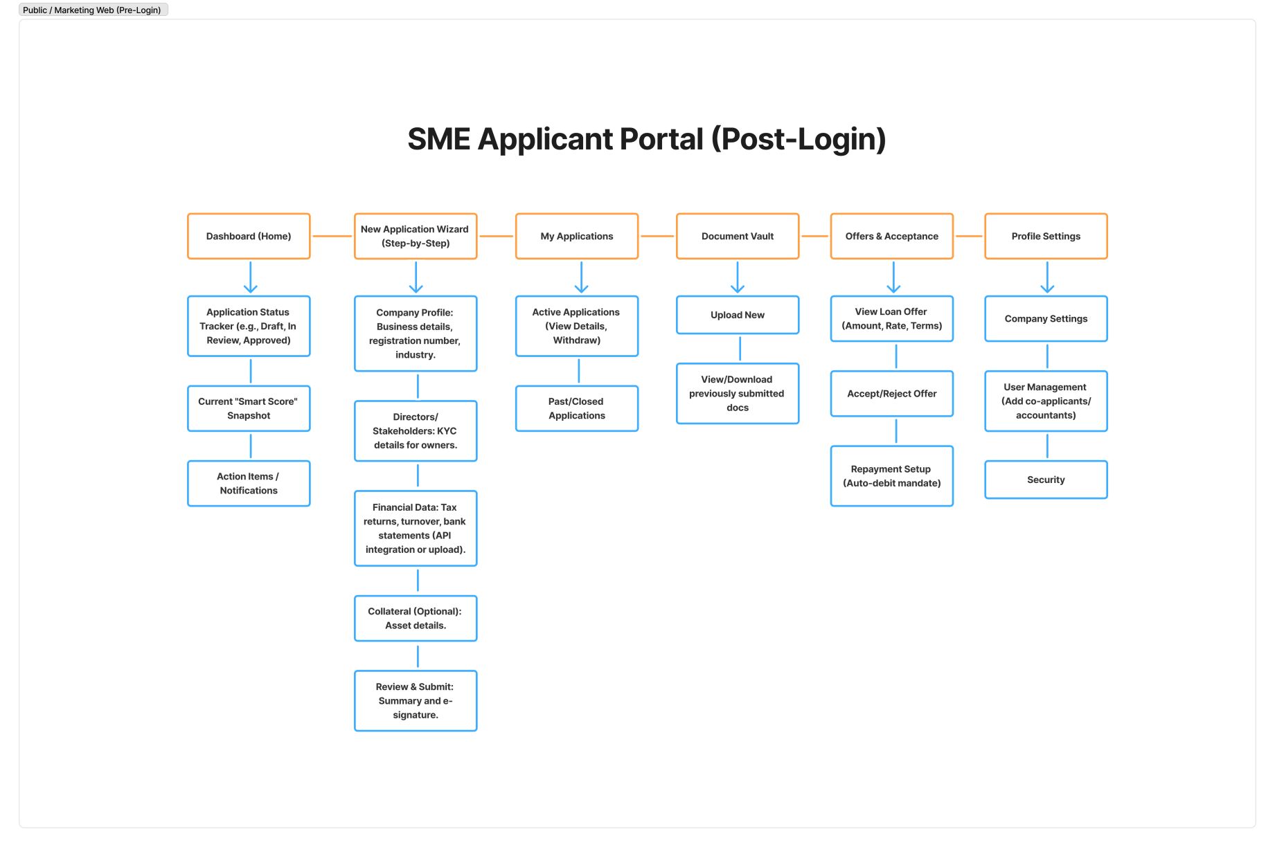This structure is designed to support two distinct user journeys: the SME Applicant (seeking a loan) and the Bank/Loan Officer (processing the application and managing the “Smart Score”).