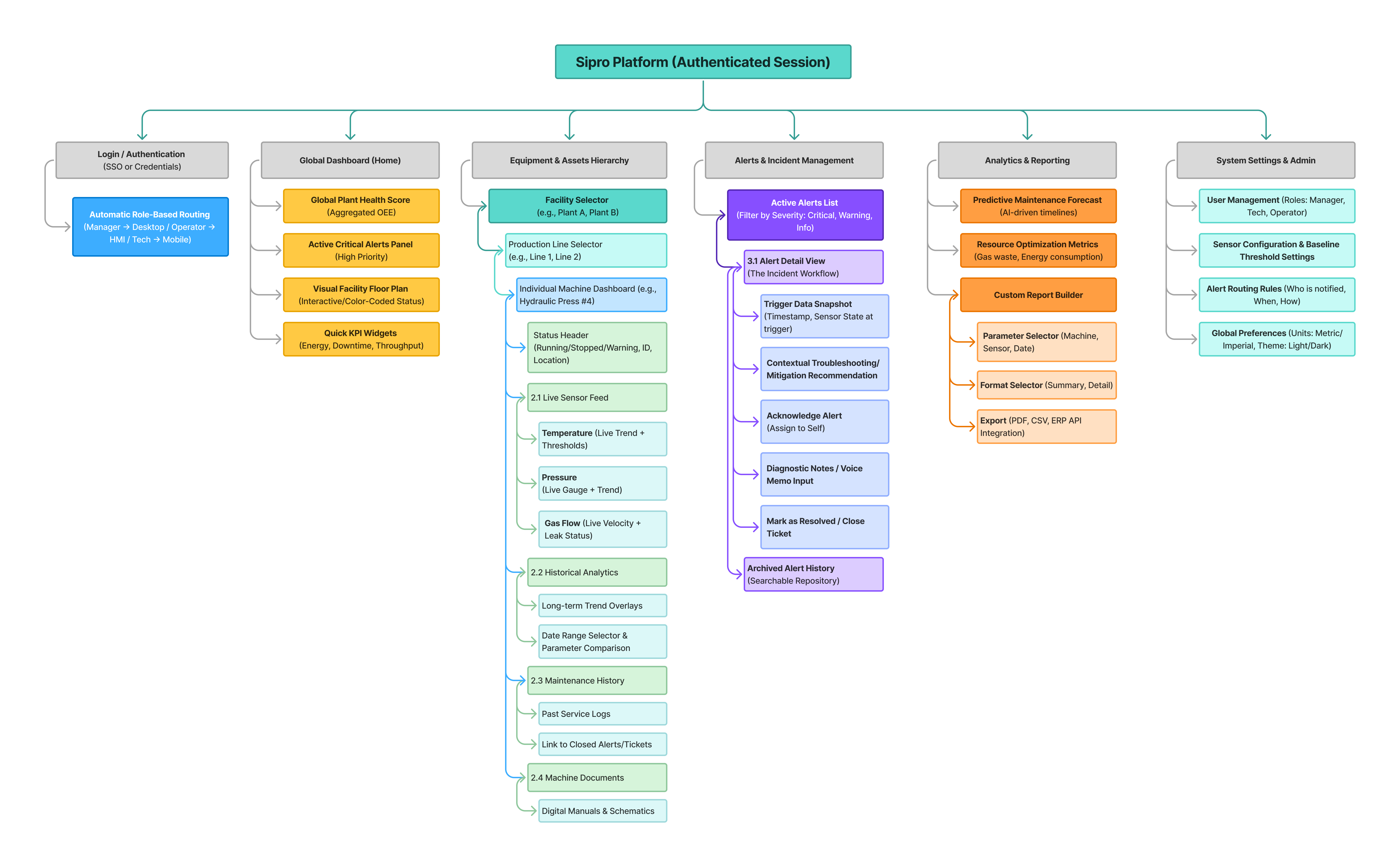 This structure applies Progressive Disclosure, meaning it starts with high-level summaries (for Plant Managers and Operators) and allows users to drill down into granular, specific sensor data (for Maintenance Technicians).